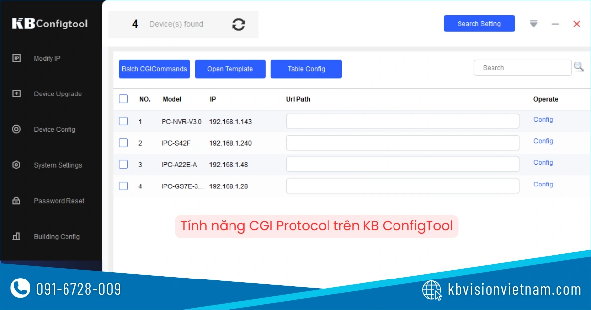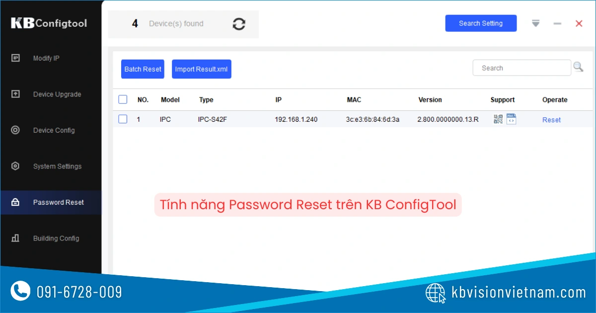 Ngoài chức năng dò tìm camera, KB ConfigTool cũng hỗ trợ nhiều tính năng hữu ích khác thay đổi địa chỉ IP, reset mật khẩu, cấu hình camera, cập nhật firmware, … Các bạn có thể xem chi tiết giao diện làm việc của từng tính năng qua ảnh bên dưới.