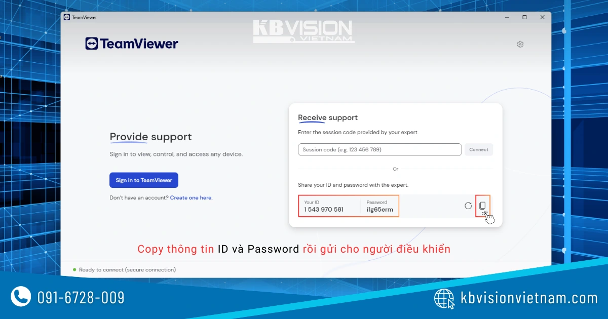 - Receive support: Dành cho người dùng nhận hỗ trợ từ xa, hay nói cách khác là để người khác điều khiển máy tính của mình. Bạn chỉ việc gửi thông tin gồm ID và Password cho người điều khiển là xong. Sau khi cấp quyền truy cập thì máy tính của bạn sẽ bị người khác điều khiển.