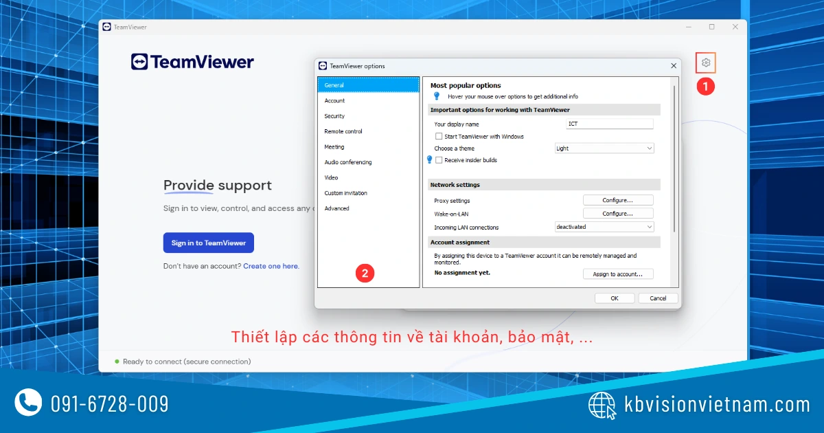 Tại giao diện trang chủ của phần mềm TeamViewer, các bạn nhấn vào biểu tượng bánh răng ở góc trên bên phải để mở trình cài đặt. Tại đây bạn có thể thiết lập các thông tin liên quan đến Tài khoản, Bảo mật, Định dạng âm thành và hình ảnh,